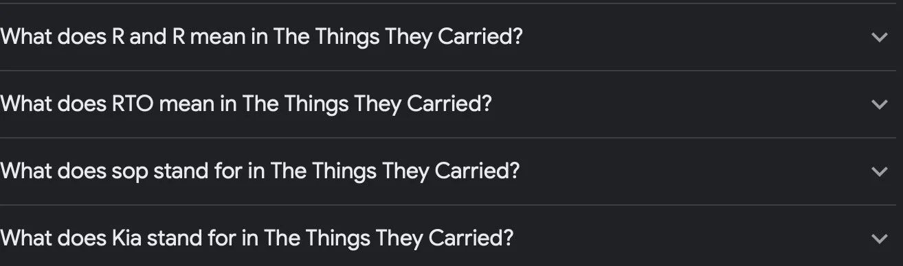 On Google, related searches in the “People Also Ask” feature highlight how insular the language in the “The Things They Carried” is.